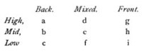 On pp. 15-16, Bell recounts how, after much puzzling over the articulation of the vowel of sir, he got the idea of the the tongue not only being raised to the hard or soft palate but also medially between them. Bell’s unique conceptual break with the past was to view the mouth as a continuous space where the tongue would move freely to create an infinity of new vowels, with tongue positions defined on the analogy of longitude and latitude. Initially, he divided the mouth into nine cardinal regions: front, mixed (that is, today’s central) and back positions along the hard and soft palates vs. high, mid and low degrees of tongue height. Each could be subdivided into nine smaller regions by inner vs outer shifts (i.e. retracted vs advanced) and higher vs lower shifts (i.e. raised vs lowered). All of these were either primary or wide (what is now called tense or lax).
