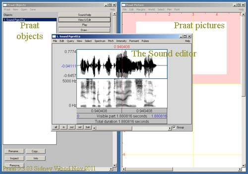 The Praat Sound editor provides basic editing functions like copying, cutting and pasting sound selections. It is also a convenient place for viewing and playing sound data, and making and inspecting various analyses such as spectrograms and pitch: