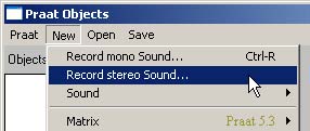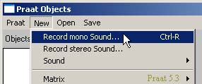 - The Sound recorders are opened from the Objects window. In the New menu select Record mono sound or Record stereo sound depending on what you want to do: