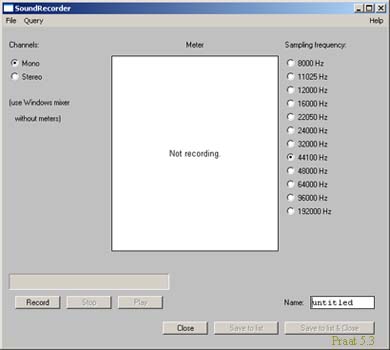 - Open the Praat Sound recorder, mono or stereo as required.