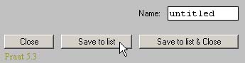 There’s a group of buttons in the bottom right corner of the Sound recorder, for finishing the task of recording. Click Save to list and the new recording will be transferred to the Objects list in the Objects window with the name taken from the name box. The default name “untitled” will be used if you don’t provide a name.