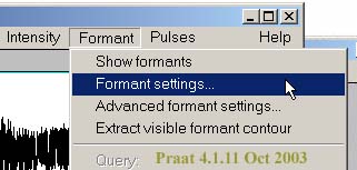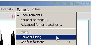 - Once the parameters are optimized you can read off track values to get the formant frequencies at some instant of interest. For example, make a selection around some vowel that interests you or position the cursor there (do not include consonants in the selection). Then open the Formant menu and select Formant listing: