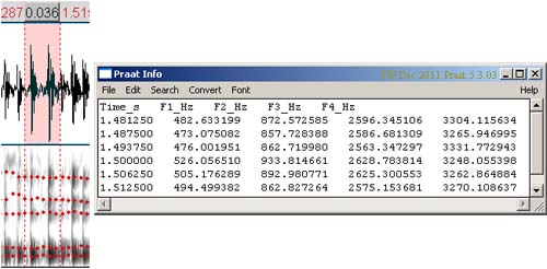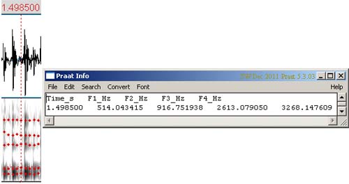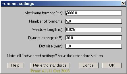 - The number of formants to be reported is set at Number of formants. The default setting is 5 formants, exemplified above.