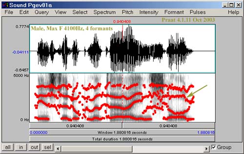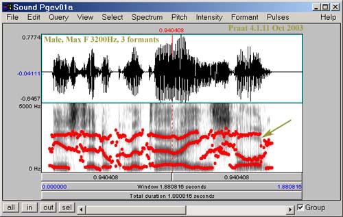 - However, the F3 track in the final vowel deviated noticeably from the F3 on the spectrogram (see the green arrow above). The fewer formants you ask Praat to search for, the trickier becomes the task of finding them. This example demonstrates the wisdom of asking for a few more formants than you actually need, to ensure successful tracking of the formants you really want to see. The following version is the result of asking for four formants below 4100Hz. The arrow (below) now shows that the F3 track at the end of the last vowel follows F3 on the spectrogram more closely: