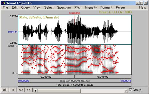 - This concerns the red dots of the formant tracks. You might find it convenient to reduce Dot size to 0.5mm or smaller, to avoid concealing too much of the spectrogram behind the dots of the formant track. Or, use a larger dot for a large Sound editor window, and a smaller dot for a smaller Sound editor window. This does not affect the analysis, but the result can be easier to look at: