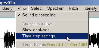 - View dependent: There is a constant number of steps across the Sound editor window, that you specify in the space provided. This step size depends on the duration of the portion of signal on view; the more you zoom in, the shorter the time step will become. The default setting is 100 Time steps.