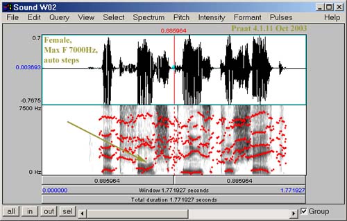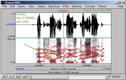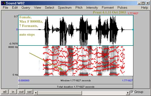 - The fifth formant is now tracked, but not everywhere, and sometimes at the expense of lower formant tracks. The F2 track of the back vowel (arrowed) has now disappeared.