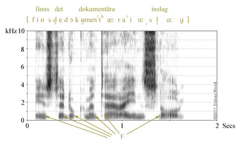 - When you look at a spectrogram, like this example, you will see formants everywhere, in both vowels and consonants. To understand why, you must recall the source-filter theory of speech production. The vocal tract filters a source sound (e.g. periodic voice vibrations or aperiodic hissing) and the result of the filtering is the sound you can hear and record outside the lips and show on a spectrogram. Formants occur, and are seen on spectrograms, around frequencies that correspond to the resonances of the vocal tract, i.e. at frequencies where the impedence is low (impedence is resistance to vibration at a given frequency).