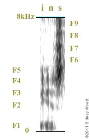 By convention, oral formants are numbered consecutively upwards from the lowest frequency. The example to the left is a fragment from the previous wideband spectrogram and shows the sequence [ins] from the beginning. Five formants are visible in this [i], labelled F1-F5. Four are visible in this [n] (F1-F4) and there is a hint of the fifth. There are four more formants between 5000Hz and 8000Hz in [i] and [n] but they are too weak to show up on the spectrogram, and mostly they are also too weak to be heard. The situation is reversed in this [s], where F4-F9 show very strongly, but there is little to be seen below F4. |