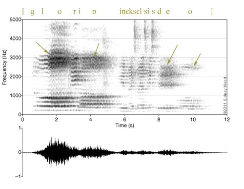 - If you are studying the spectral qualities of singing, you will also want to look at F3 and F4, which can be made much stronger in singing than in speaking. Trained singers manipulate F3 and F4 by lowering the larynx and elevating the tongue blade to enhance this part of the spectrum and make it heard above an orchestral accompaniment. The following narrowband spectrogram, of the phrase Gloria in excelsis Deo sung by a barytone voice, illustrates this enhanced F3+F4 region around 2-4kHz: